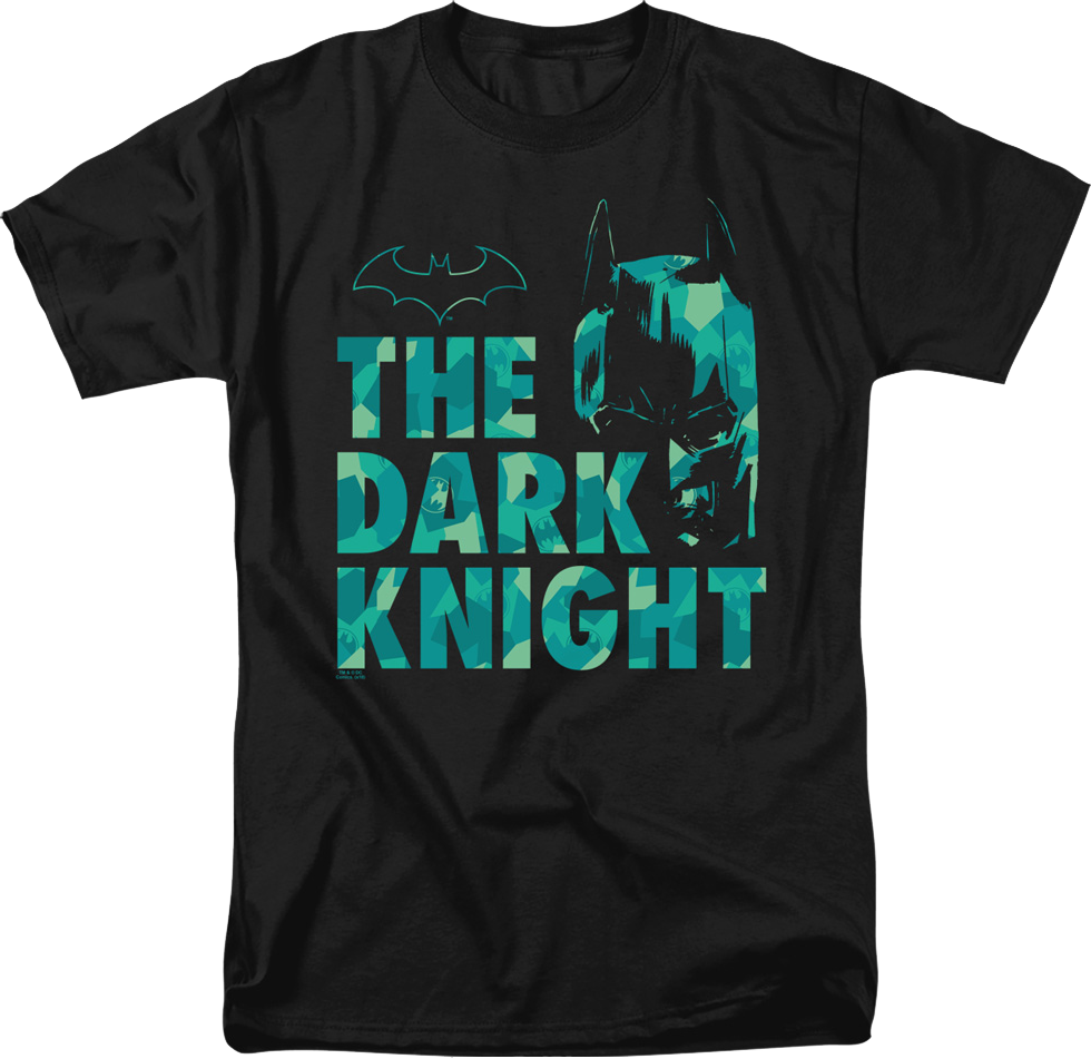 The unmistakable cowl and Bat Symbol is shown on this Batman The Dark Knight DC Comics T-Shirt in a geometric camouflage. Bruce Wayne and his caped alter-ego have been protecting the streets of Gotham against evil-doers for generations. Villains know their plans have been foiled when they see the menacing eyes of The Bat.