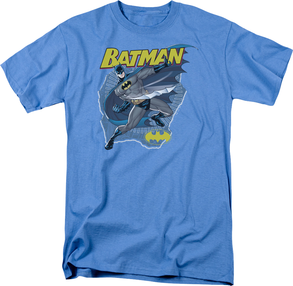 This Batman t-shirt shows the Caped Crusader throwing his Batarang to stop a villain from committing crimes in Gotham City.