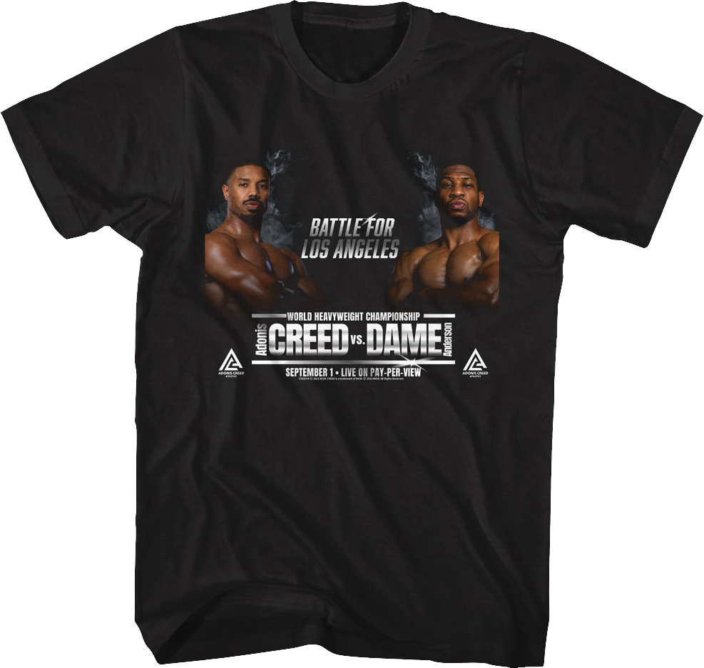 This Creed t-shirt features a poster for the boxing match between Adonis Creed and Damian "Dame" Anderson. The poster reads "Battle For Los Angeles".