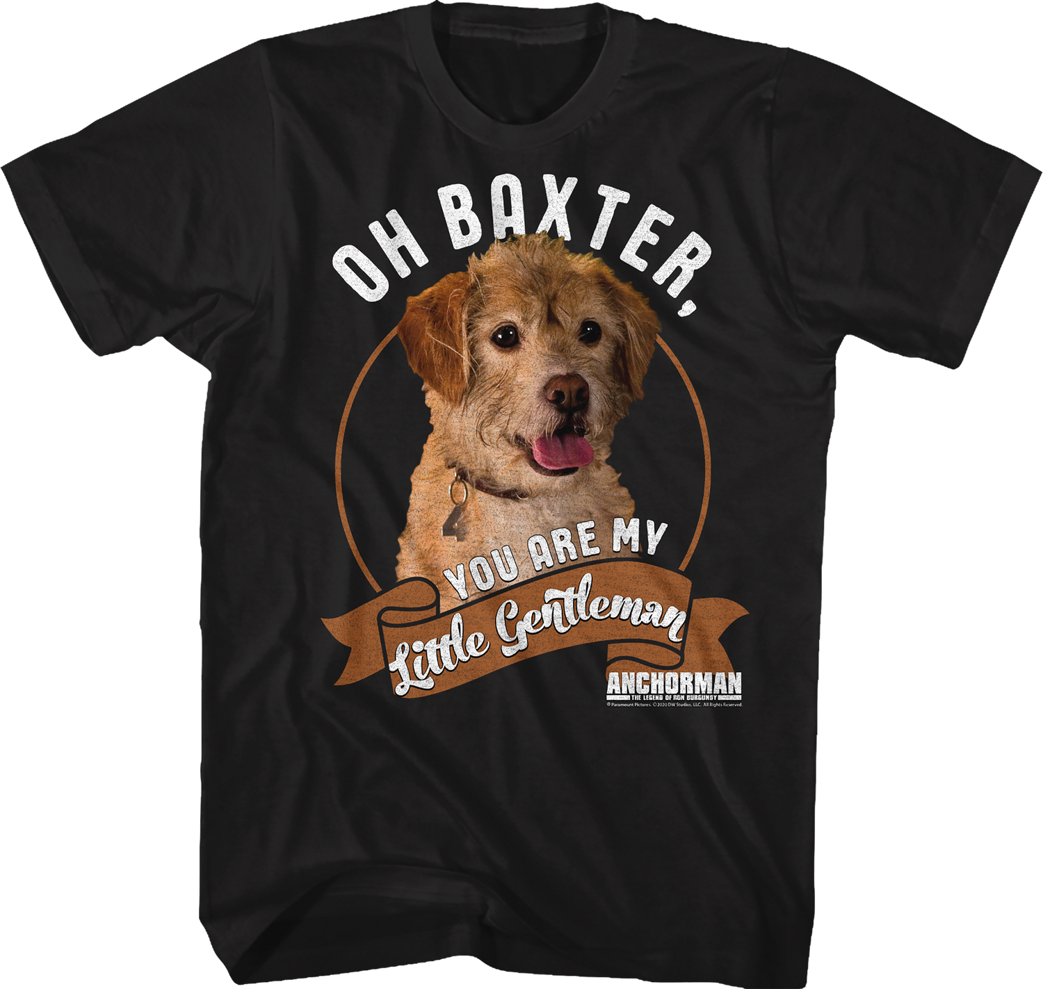 This Anchorman t-shirt features an image of Baxter, Ron Burgundy's beloved pet dog who Ron refers to as his "little gentleman".