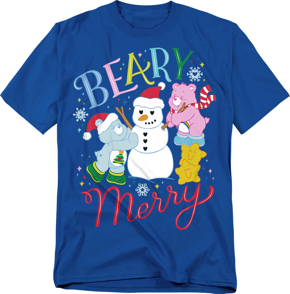 This Care Bears t-shirt shows Christmas Wishes Bear and Cheer Bear building a Christmas snowman. The shirt reads Beary Merry.