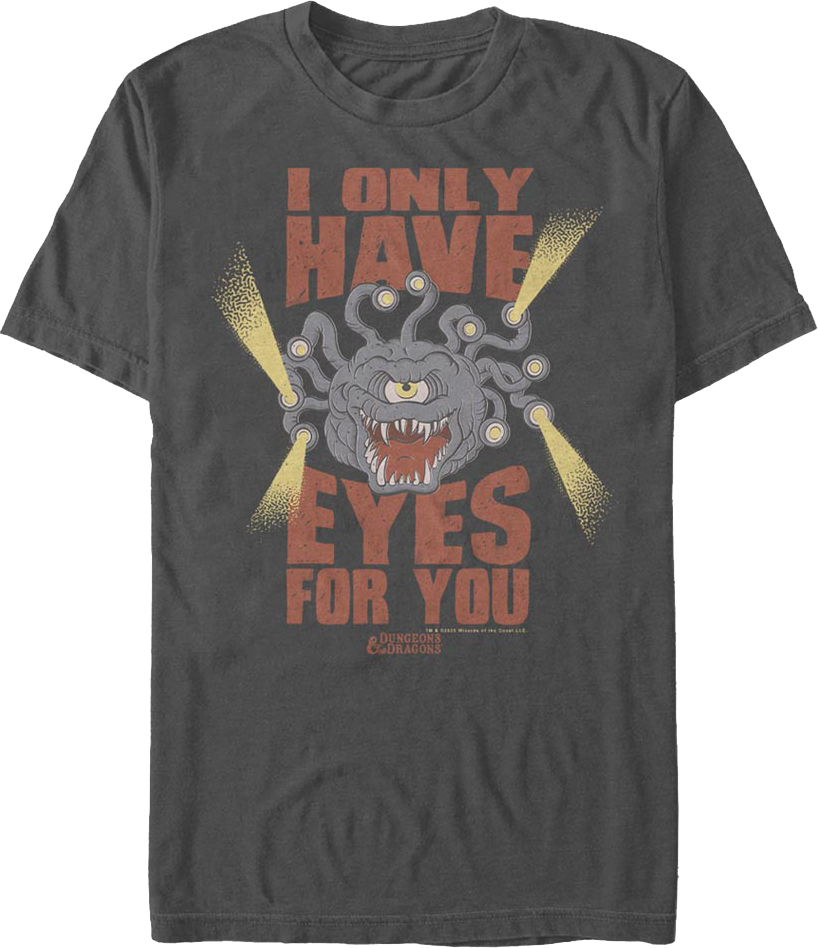 This Dungeons & Dragons t-shirt features an image of the large, orb-shaped being with ten eyestalks known as The Beholder. The shirt reads I Only Have Eyes For You.