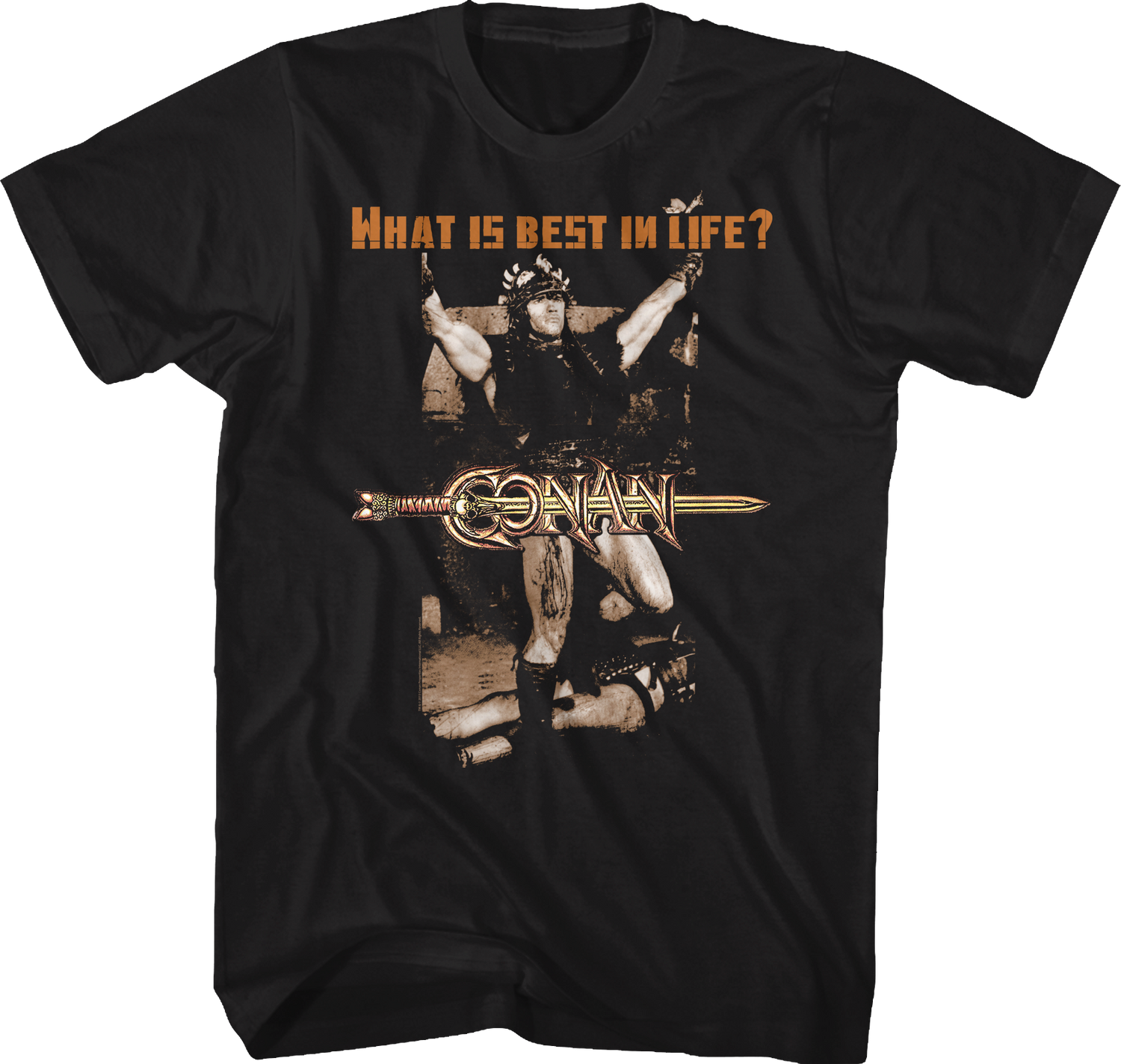 This Conan the Barbarian t-shirt features the question "What is Best in Life?", which was posed to Conan by the Mongol General. Conan's answer is on the back "To crush your enemies. See them driven before you and to hear the lamentation of the women." Conan the Barbarian is the 1982 movie that made Arnold Schwarzenegger a household name.