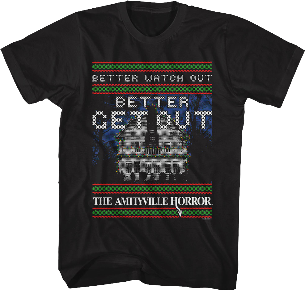 For any fan of the terrifying classic starring James Brolin and Margot Kidder, this Better Watch Out Faux Ugly Christmas Sweater Amityville Horror T-Shirt is a must have!