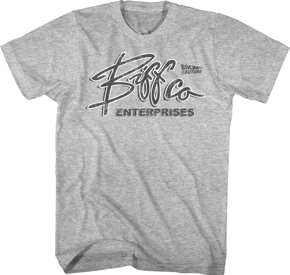 This Back To The Future shirt features the logo for Biff Co Enterprises, Biff Tannen's company that he formed with the money he won by gambling with the help of a Grays Sports Almanac from 2015.