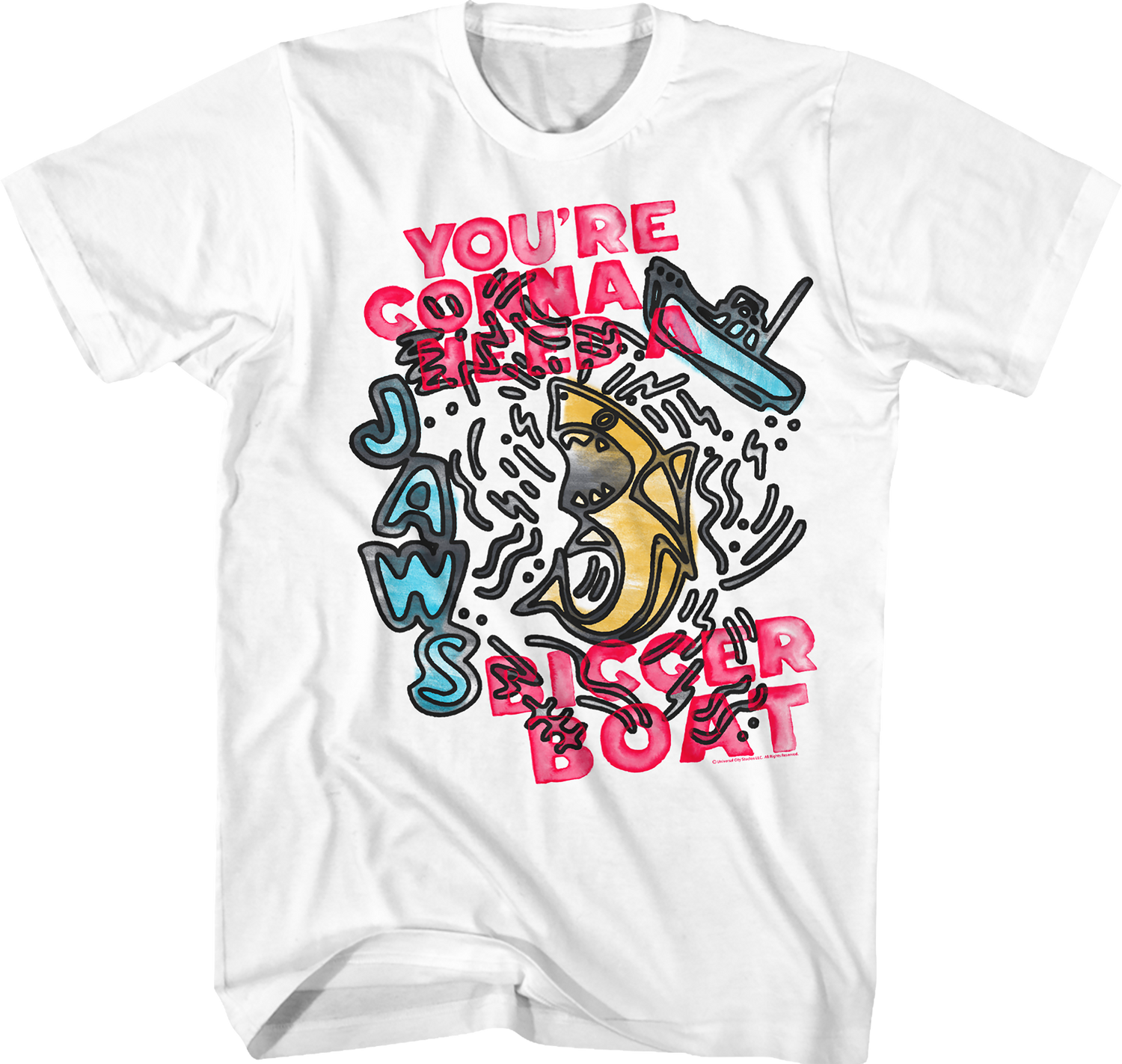 This Jaws t-shirt features a sketch of a great white shark and Quint's Orca boat. The shirt includes Chief Brody's classic quote, "You're Gonna Need A Bigger Boat".