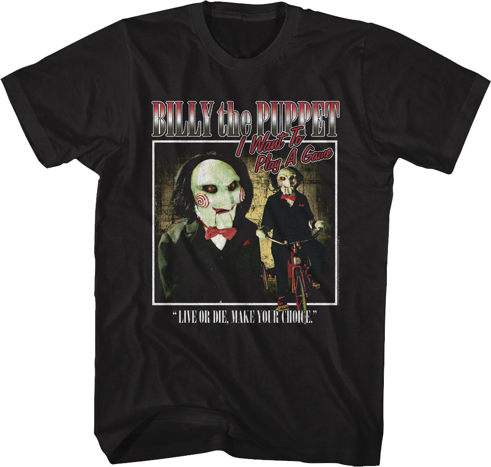 This Saw t-shirt features an image of Billy the puppet in a frame and an image of the puppet on his tricycle. The shirt reads I Want To Play A Game. The shirt includes the Jigsaw quote, "Live or die. Make your choice."