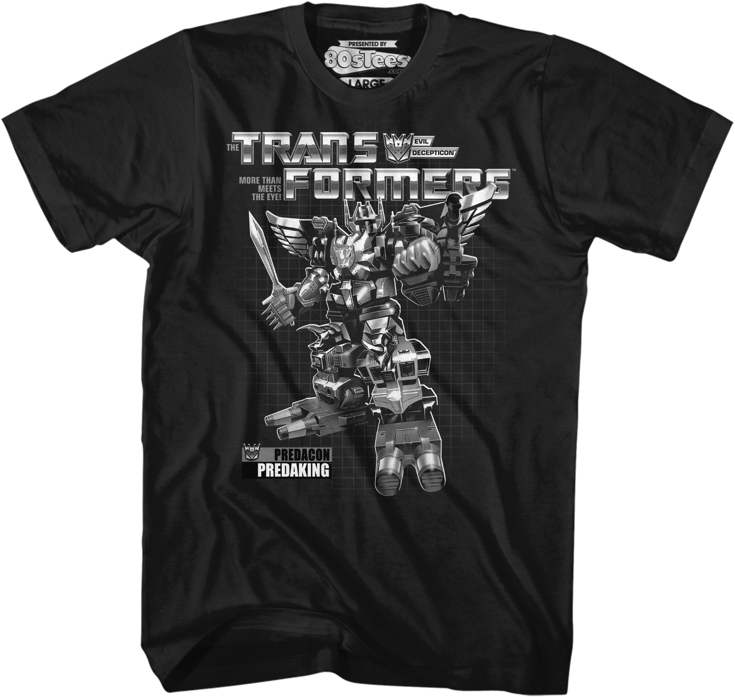Everyone will immediately know that you are a fan of the Decepticon combiner when you wear this 80sTees.com exclusive Black and White Box Art Predaking Transformers T-Shirt!