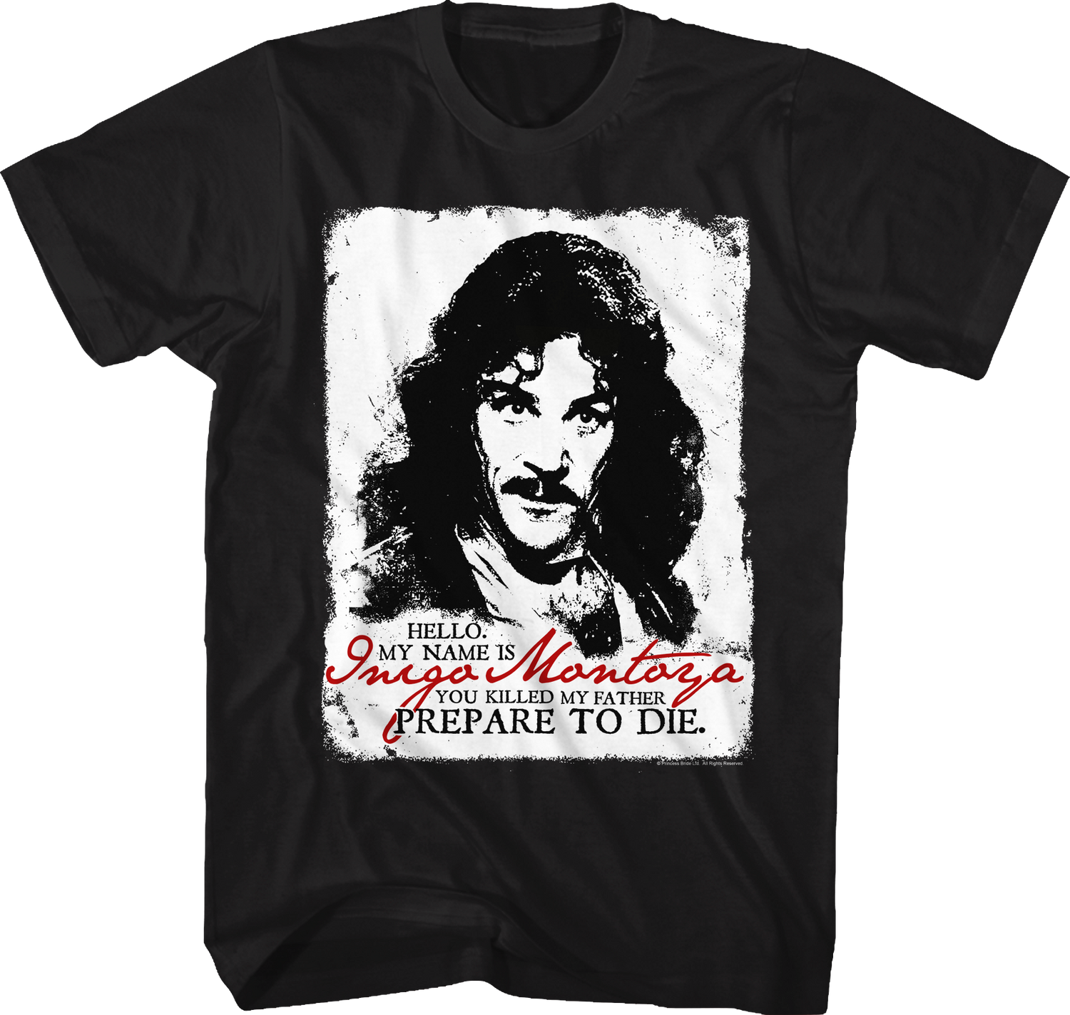 This Princess Bride t-shirt features a black and white sketch of Inigo Montoya, the Spanish swordsman who vowed to find and kill his father's six-fingered killer. The shirt includes Inigo's popular catchphrase, "Hello. My Name Is Inigo Montoya. You Killed My Father. Prepare To Die". This is one of the most famous quotes in cinematic history. Everyone will know you are a fan of the swordsman when you wear this Black and White Inigo Montoya Princess Bride t-shirt!