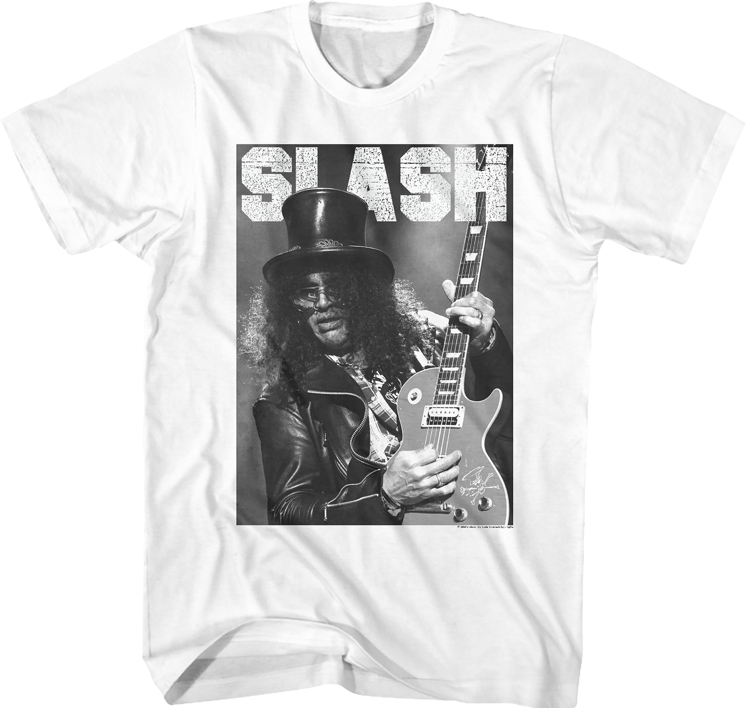 This Slash t-shirt features a black and white photo of the legendary guitarist.
