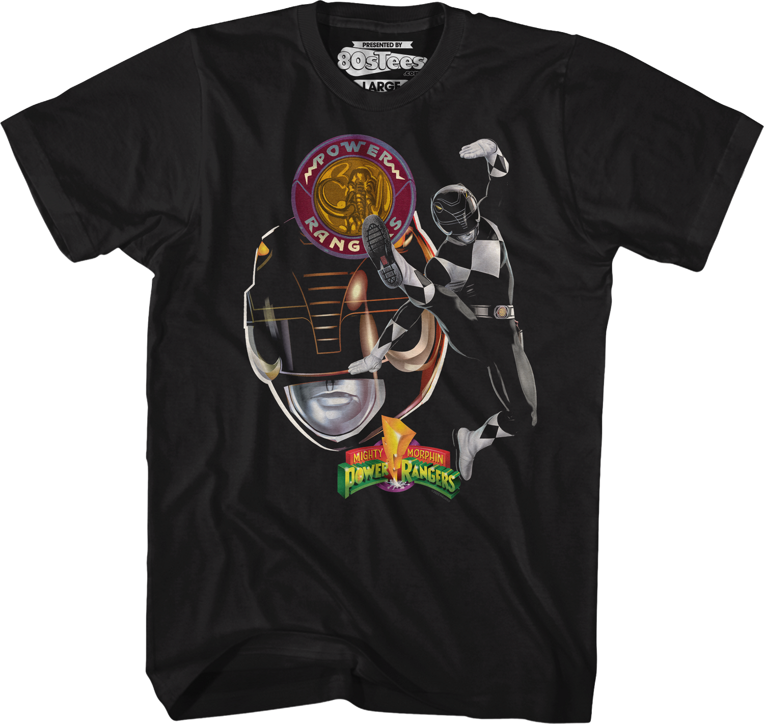 This 80sTees.com exclusive Mighty Morphin Power Rangers t-shirt shows the Black Ranger's helmet, the Black Ranger in an action pose, and the Black Ranger's Mastodon Power Coin.