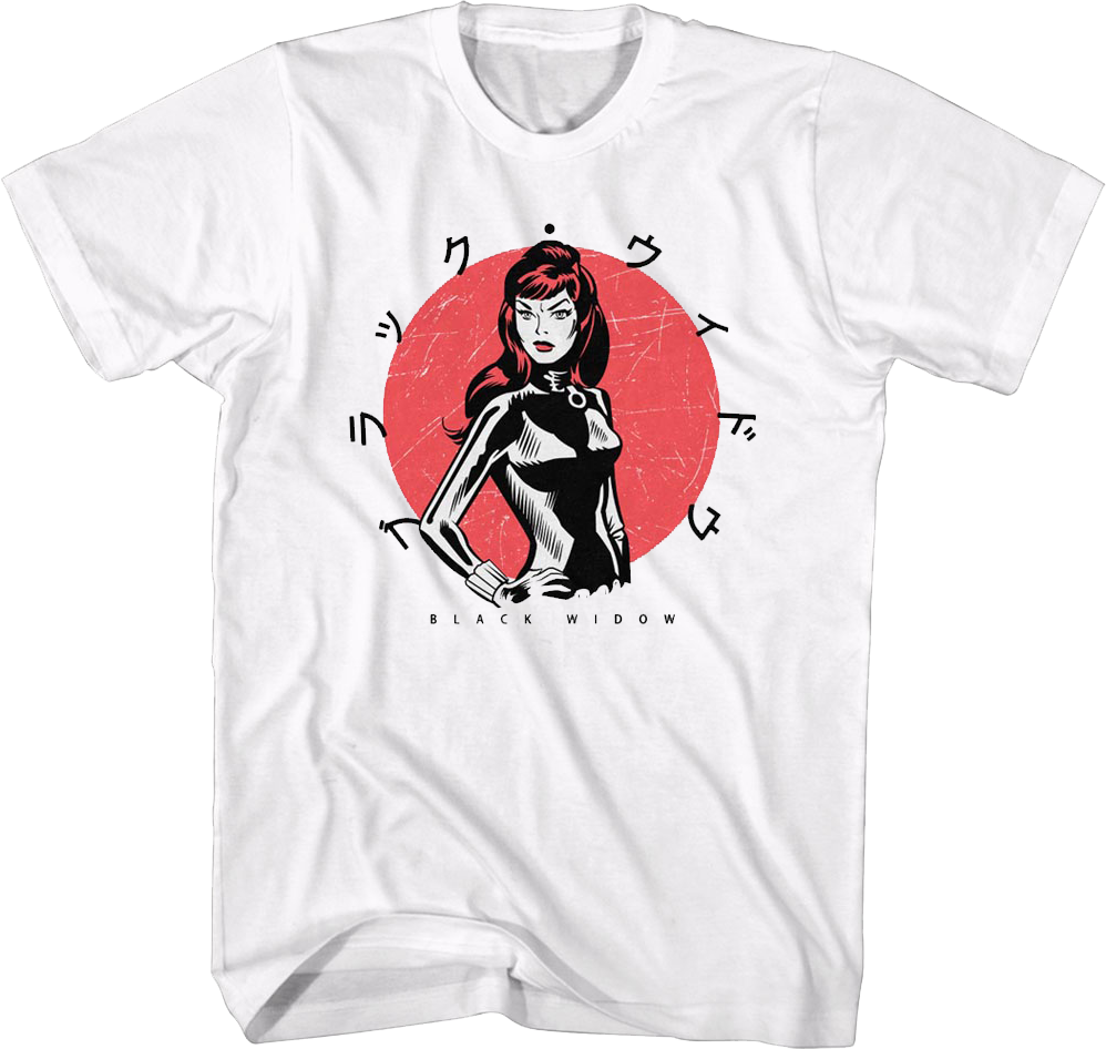 Since her first appearance in "Tales of Suspense" #52 in 1964, Black Widow is one of the most popular characters in the pages of Marvel Comics. Everyone will instantly know you are a fan when you wear this Black Widow Japanese Text Marvel Comics T-Shirt!