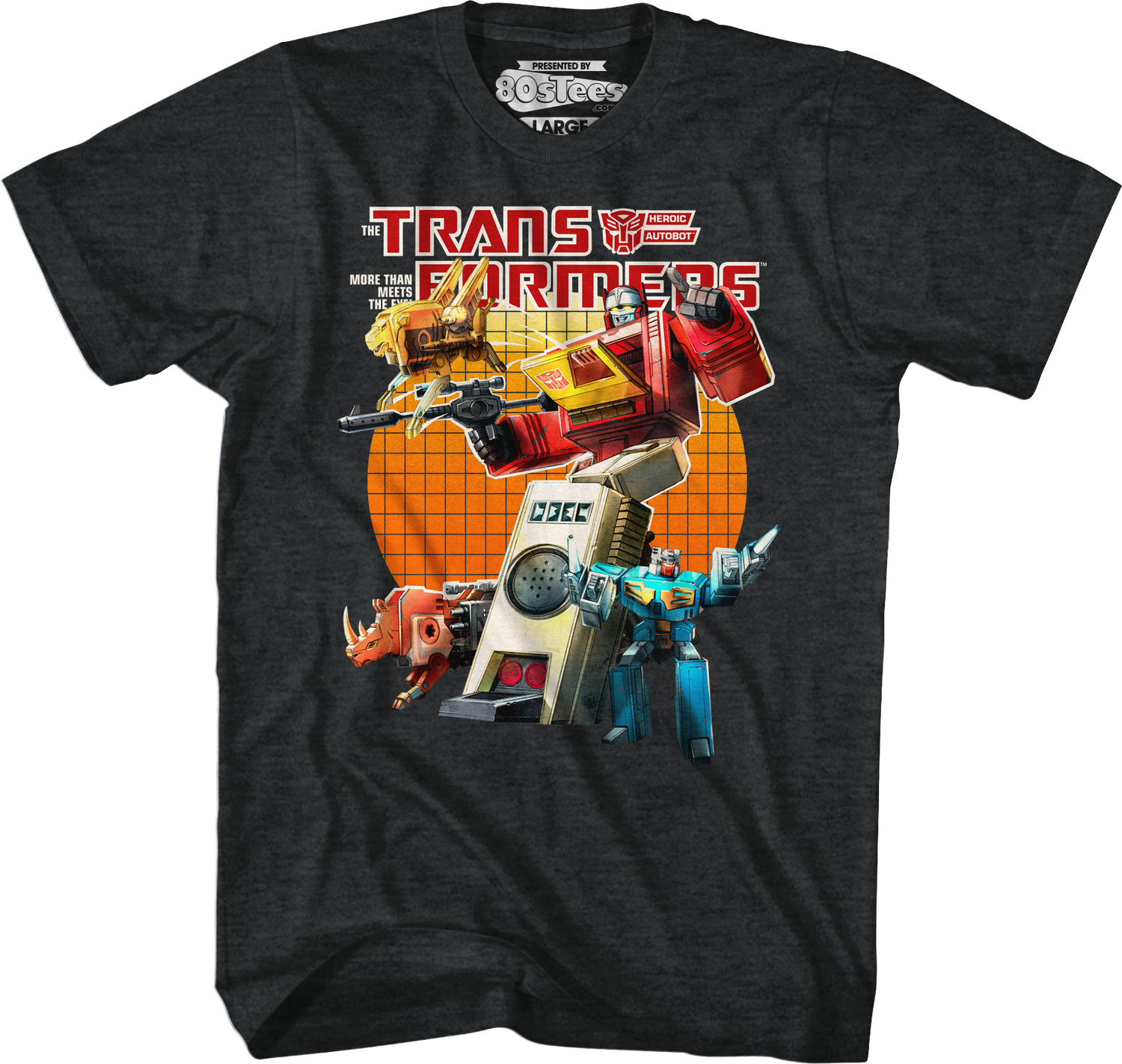 For any fan of the robot that can transform into a boombox, this 80sTees.com exclusive Blaster Squad Transformers T-Shirt is a must have!