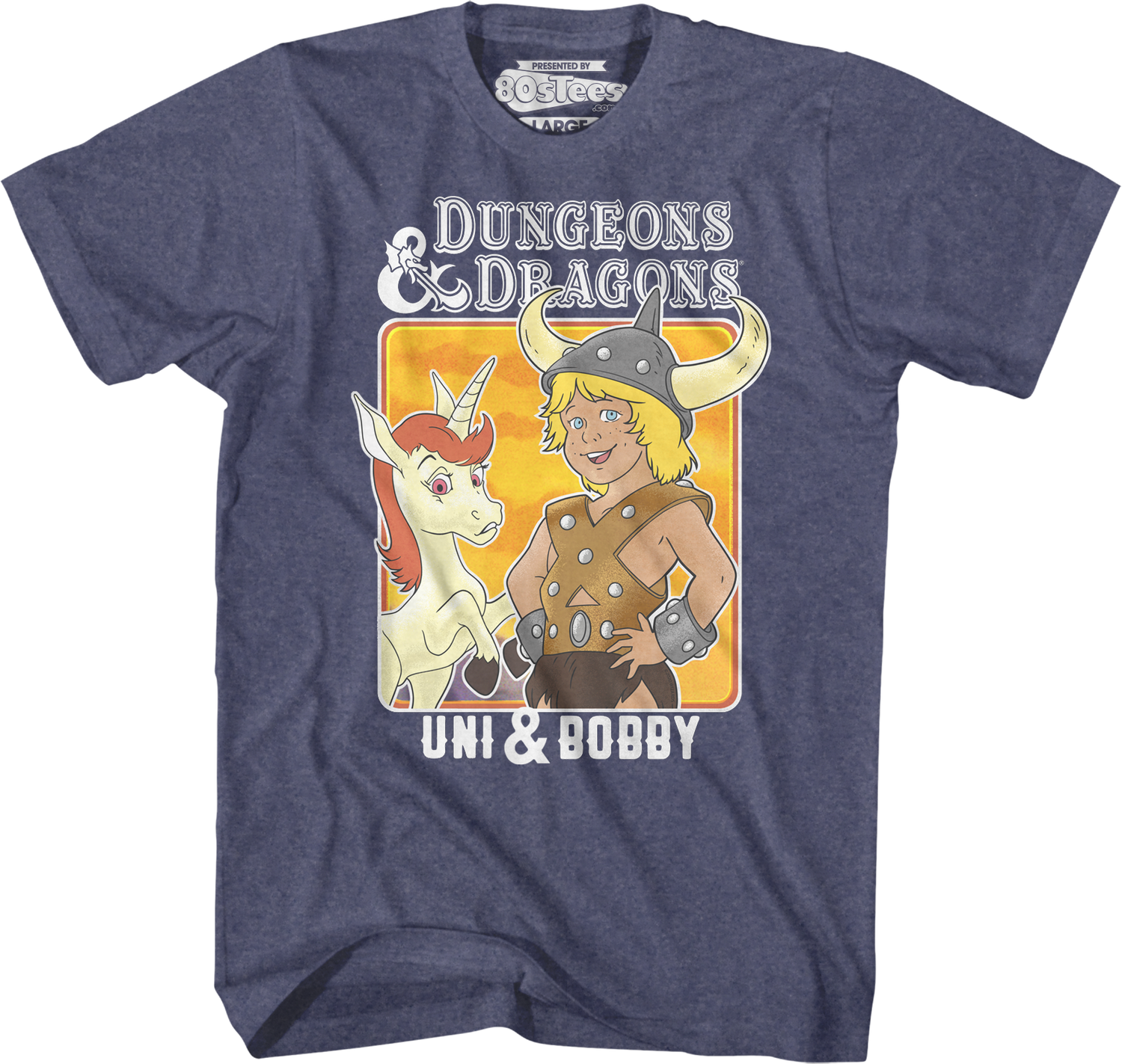 Bobby discovered Uni in the realm, and the two characters became inseparable. Bobby never wanted to be away from Uni, even when his friends found a way home. The friendship between Uni and Bobby made Dungeons & Dragons one of the most memorable animated series of all time. Everyone will know you are a fan when you wear this 80sTees.com exclusive Blue Heather Uni & Bobby Dungeons & Dragons T-Shirt!