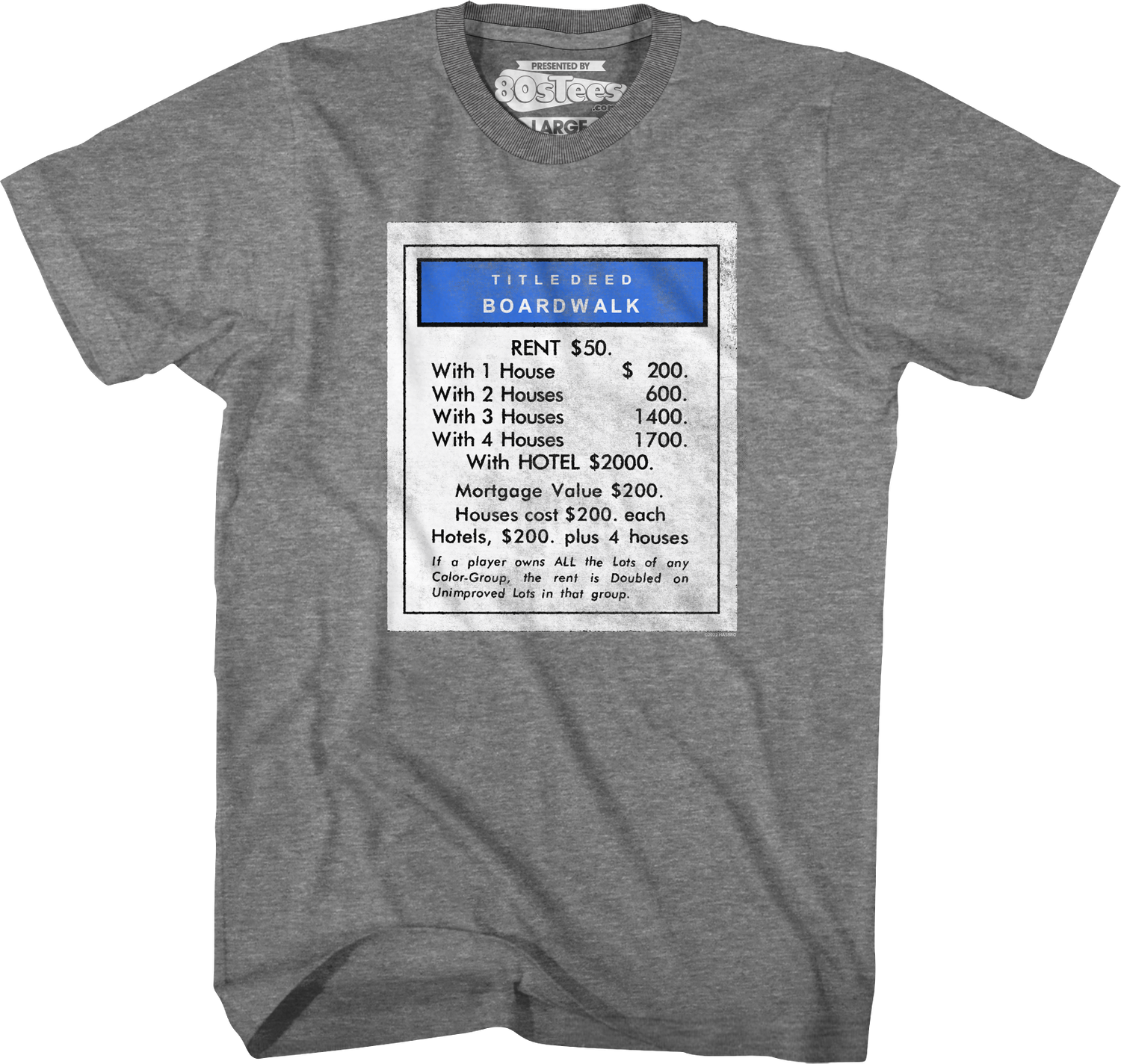This 80sTees.com exclusive Monopoly t-shirt shows the title deed for Boardwalk, the most expensive property on a standard Monopoly board.