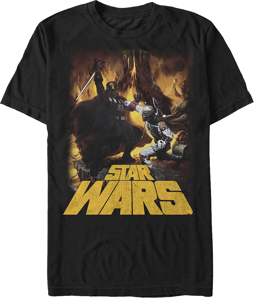 This Star Wars t-shirt shows Darth Vader battling Boba Fett. This image appeared on the cover of the fourth issue of the limited comic series Boba Fett: Enemy of the Empire.