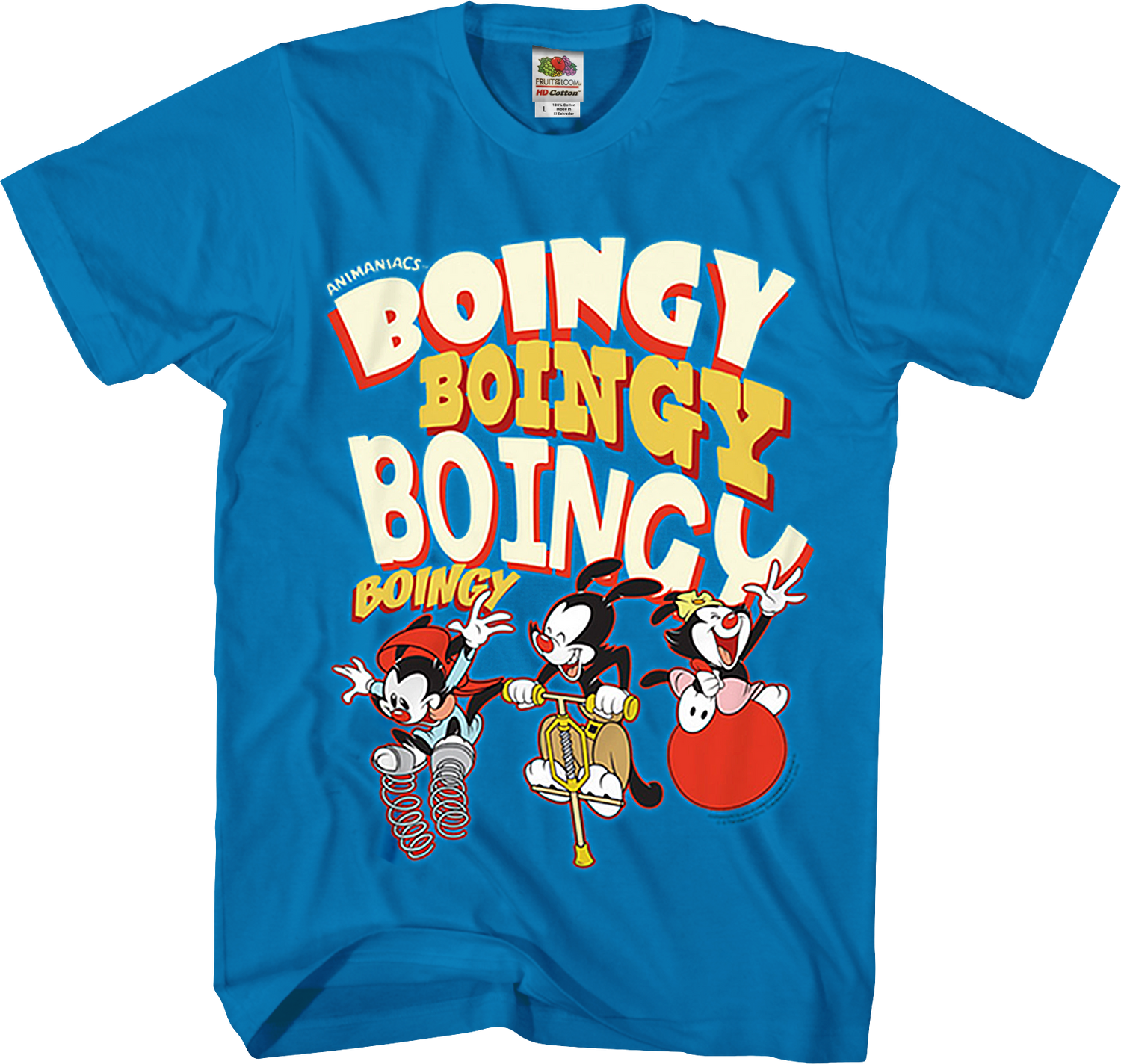 There are many phrases that appear periodically throughout the animated series Animaniacs. One of the most often used phrases is "Boingy, boingy, boingy, boingy". This is what Wakko, Yakko, and Dot would say when they jumped on springs, a pogo stick, a ball, or even Winston Churchill's belly. Everyone will immediately know that you are a fan of the classic animated series when you wear this Boiny Animaniacs T-Shirt!