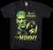 The reincarnated Imhotep is shown on this Boris Karloff The Mummy T-Shirt. He is shown laying in his sarcophagus as well as a close-up of his decayed face. In the 1932 film, a magic scroll brings the mummy back to life and he searches for his love who he believes has been reincarnated into the body of a living woman.
