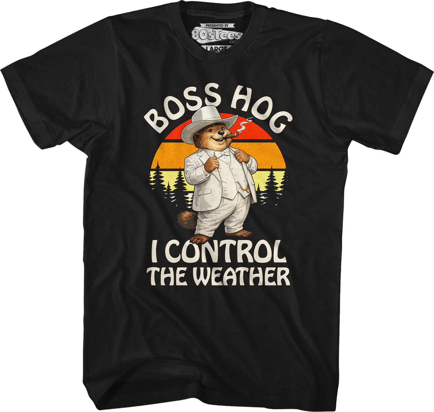 Everyone will know you are a fan of the fun February 2nd tradition when you wear this 80sTees.com exclusive Boss Hog I Control The Weather Groundhog Day T-Shirt!