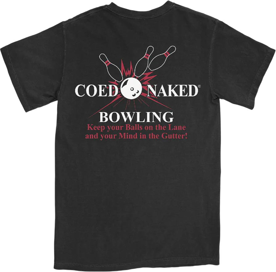 This Coed Naked t-shirt shows a bowling ball crushing bowling pins. The shirt reads "Keep your Balls on the Lane and your Mind in the Gutter!"