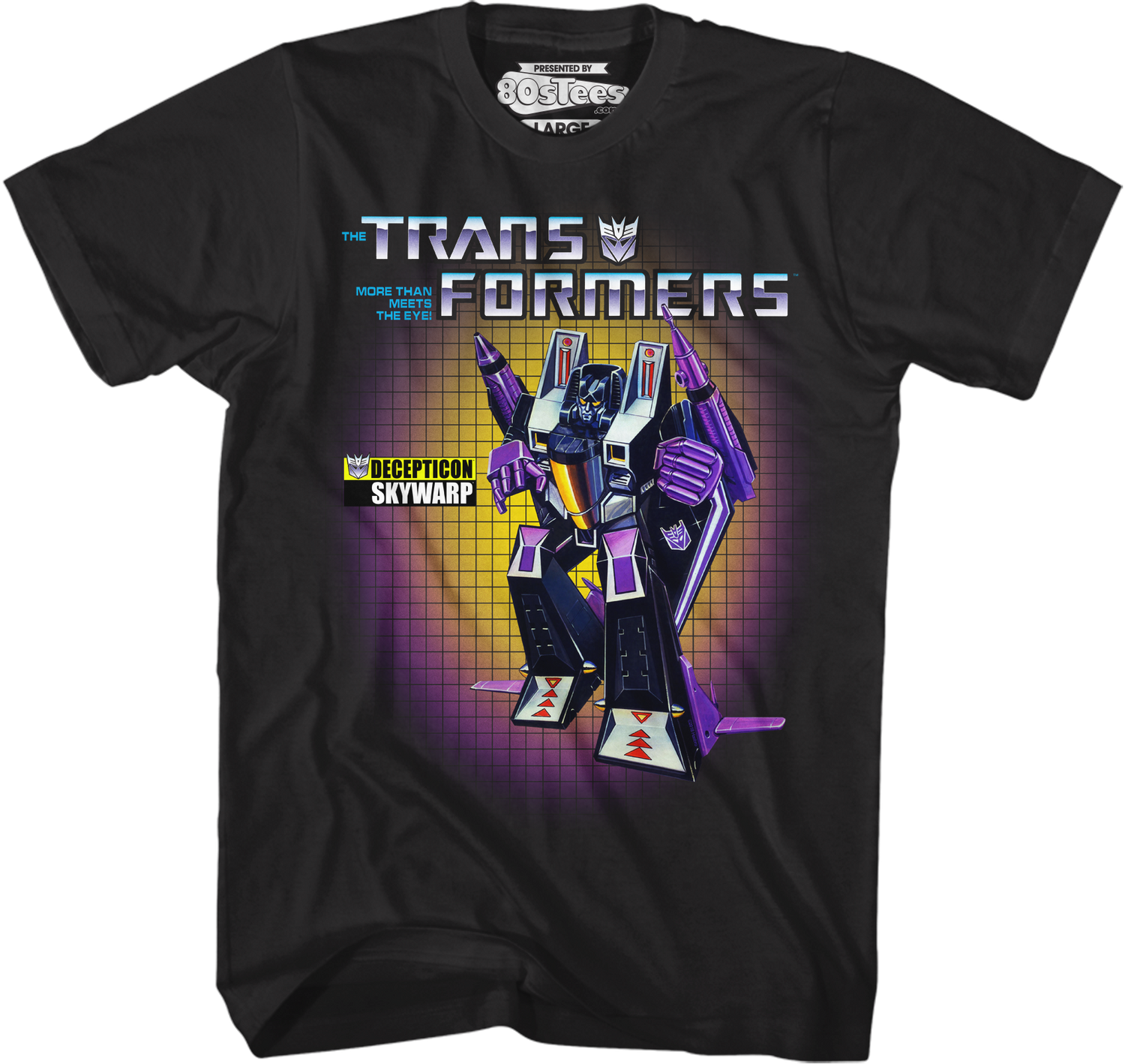 This 80sTees.com exclusive Transformers t-shirt shows the box artwork for the G1 Skywarp action figure.