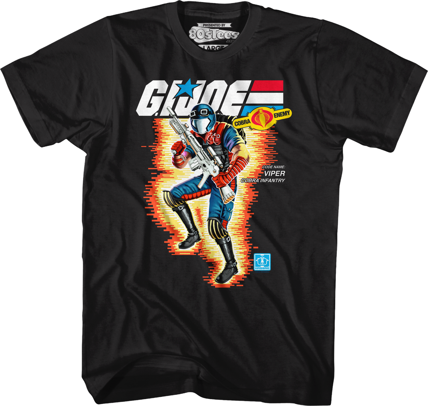 A Cobra Viper is instantly recognizable with his armored helmet, mask, vest, and assault rifle. Everyone will know you are a fan when you wear this 80sTees.com exclusive Box Art Viper GI Joe T-Shirt!