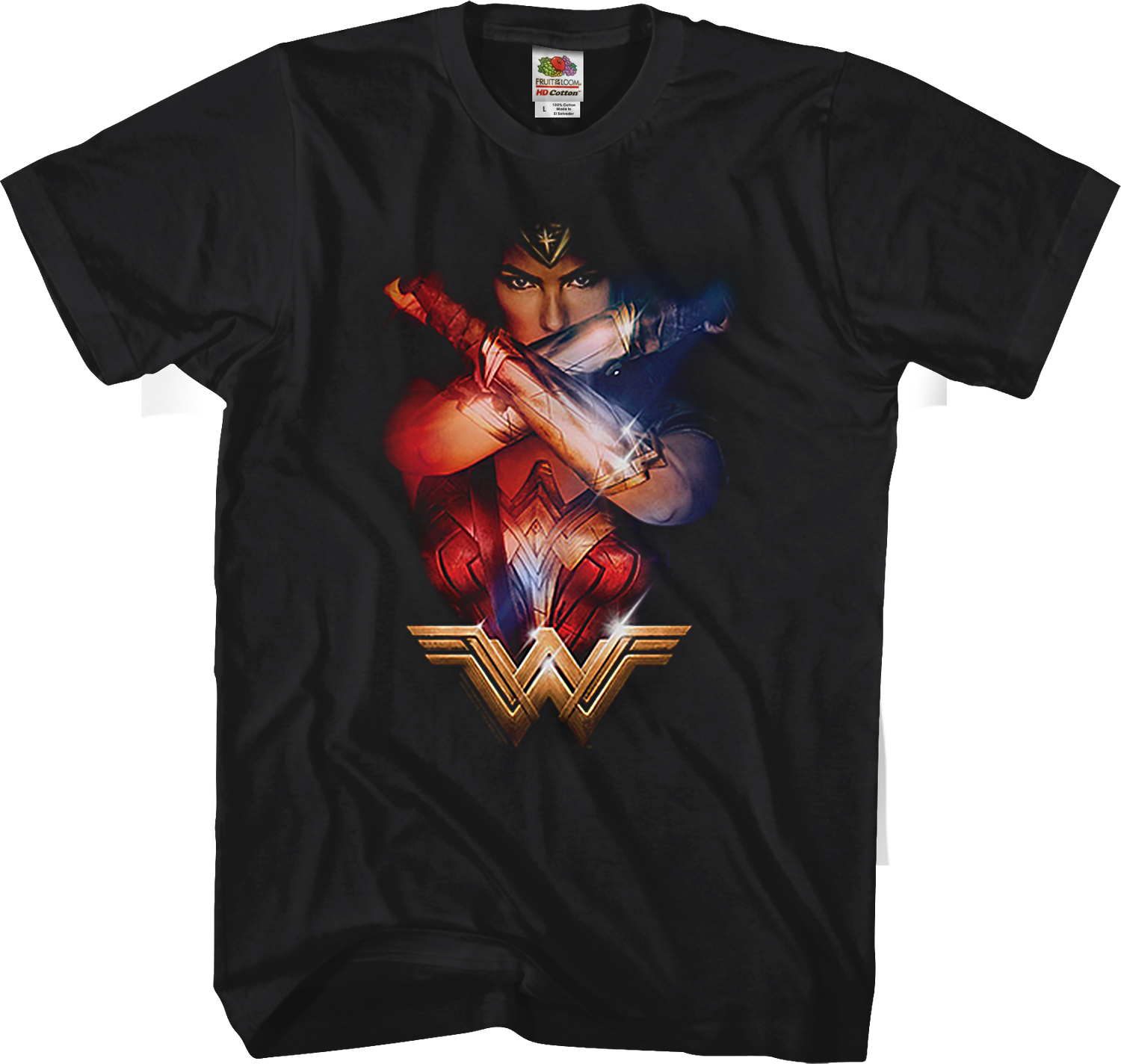 Wonder Woman appears on this t-shirt with her arms crossed, showing off her Bracelets of Submission. Wonder Woman's Bracelets of Submission are indestructible steel cuffs that the heroine uses to deflect projectile weaponry.