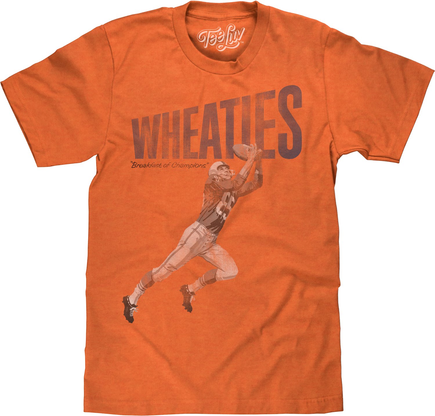 This Wheaties t-shirt shows a football player catching a football on a box of the delicious cereal. Wheaties is the crispy and crunchy cereal that is well known for featuring prominent athletes on its packages. Let everyone know that you are a fan when you wear this Breakfast Of Champions Wheaties T-Shirt.