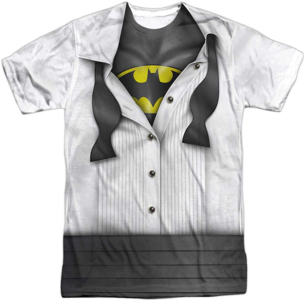 This Bruce Wayne costume t-shirt is designed to look like the billionaire playboy's tuxedo shirt with the Bat Suit underneath.