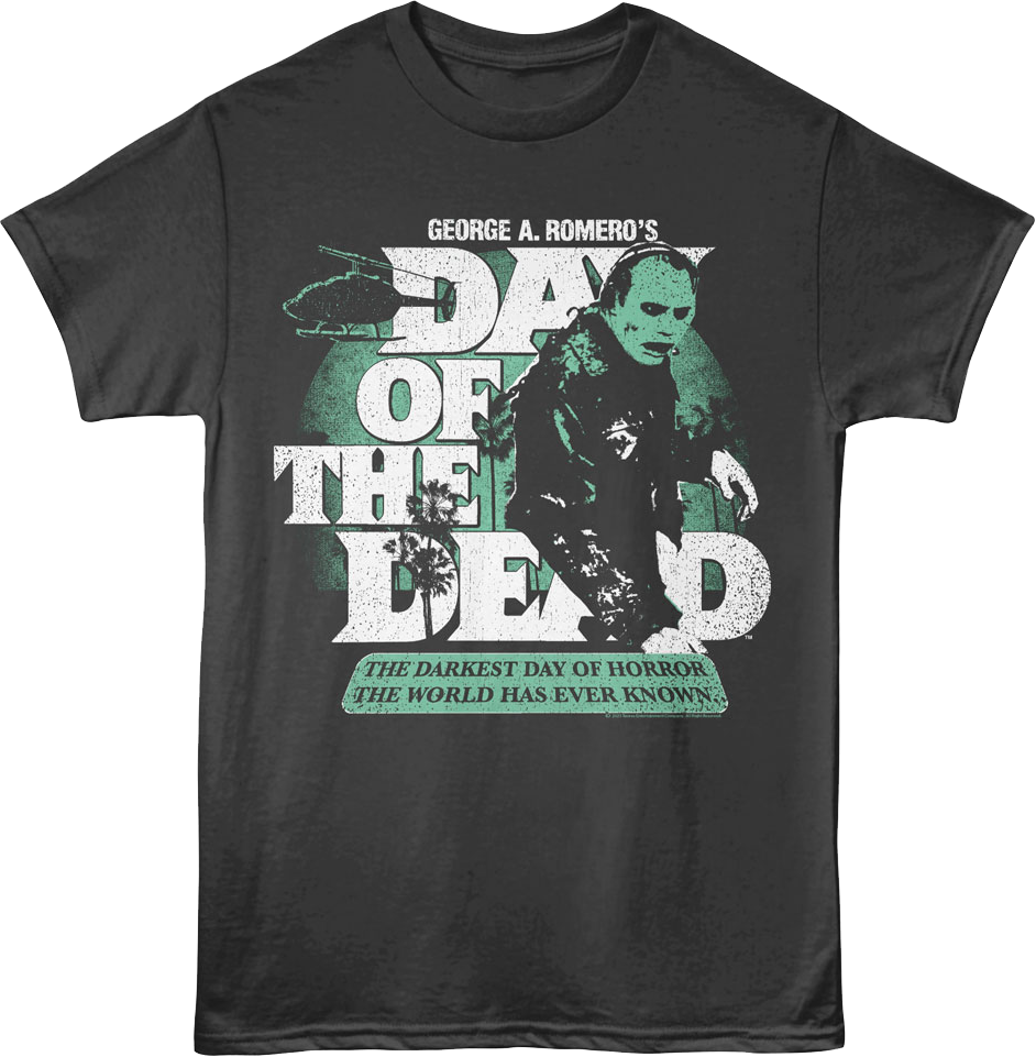 This Day Of The Dead t-shirt features the iconic zombie Bub and the silhouette of a helicopter. The shirt reads The Darkest Day Of Horror The World Has Ever Known.