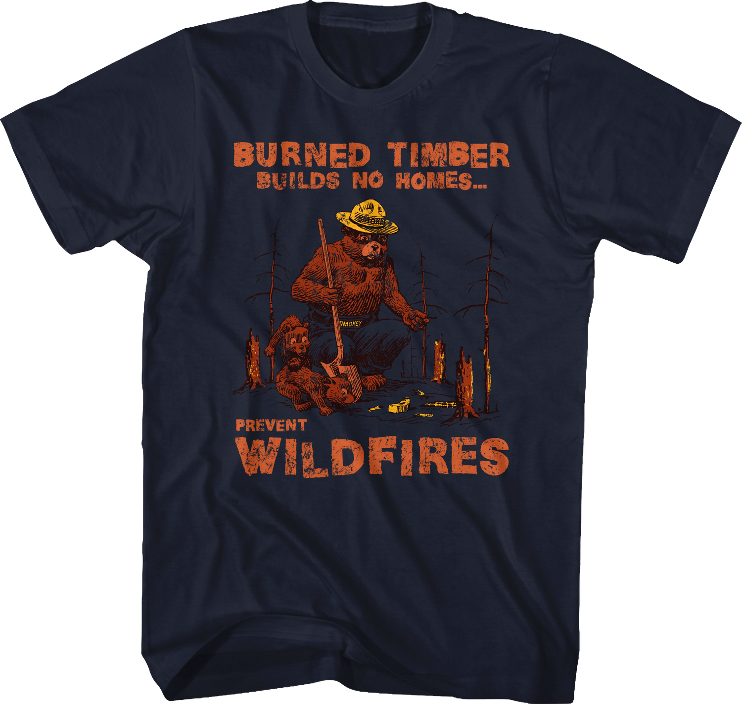 This Smokey Bear t-shirt features an image of the advertising icon with the remains of seared trees. The shirt reads Burned Timber Builds No Homes...Prevent Wildfires.
