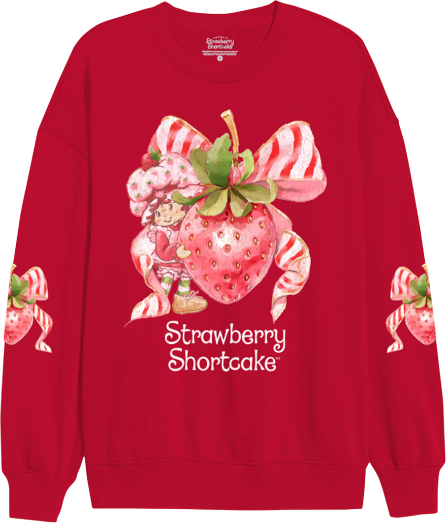 This Strawberry Shortcake sweatshirt shows Strawberry Shortcake posing with a strawberry that is wrapped in a candy cane striped bow.