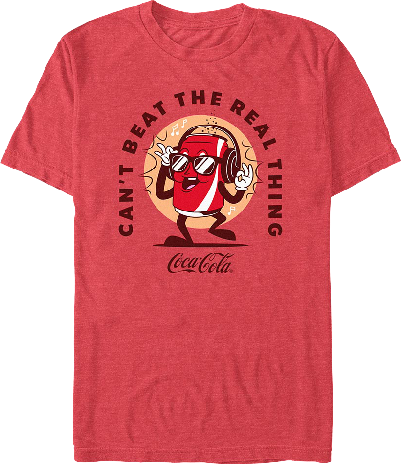 This Coca-Cola t-shirt shows a Coke can wearing sunglasses and listening to music through a pair of headphones. The shirt reads "Can't Beat The Real Thing."