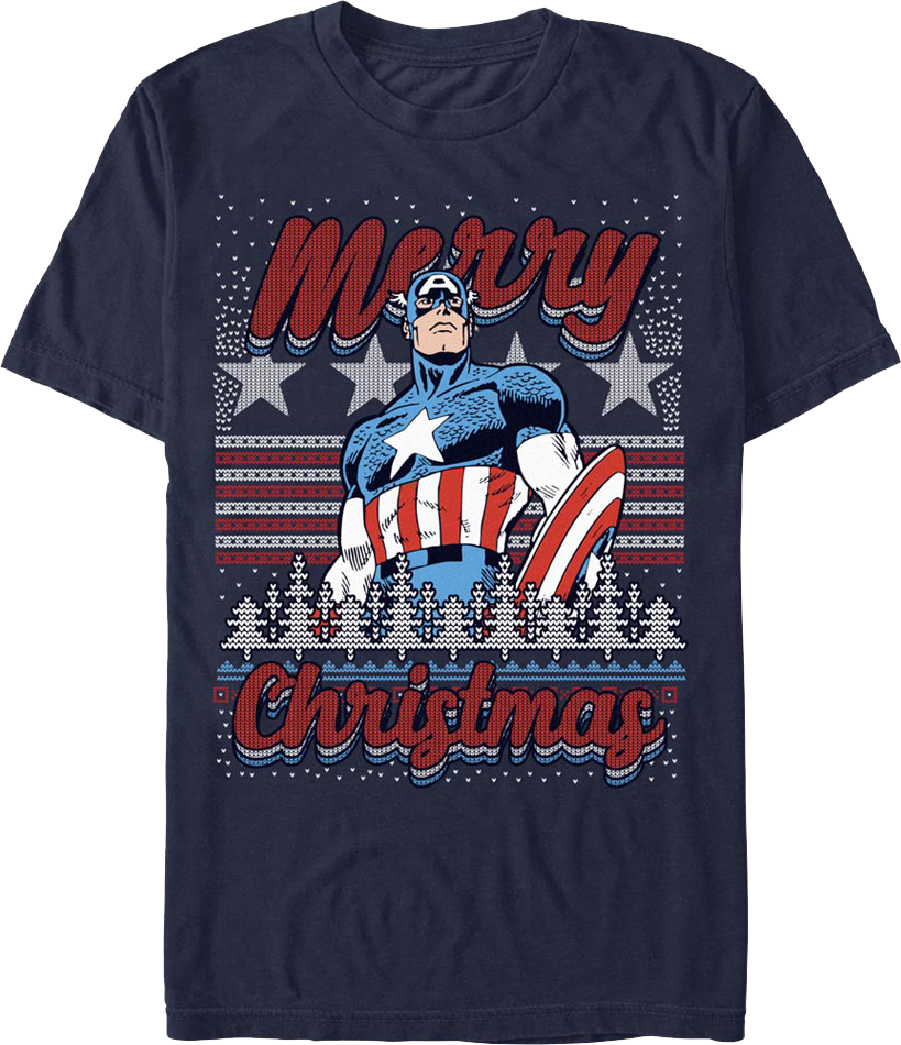 A covert U.S. Military experiment turned Steve Rogers into America's first Super-Soldier, Captain America. Decades later, Captain America was found trapped in ice and revived in the modern world. Captain America became one of the most important members of the Avengers and one of the most popular superheroes of all time. Everyone will know you are a fan when you wear this Captain America Merry Christmas Faux Ugly Sweater Marvel T-Shirt!
