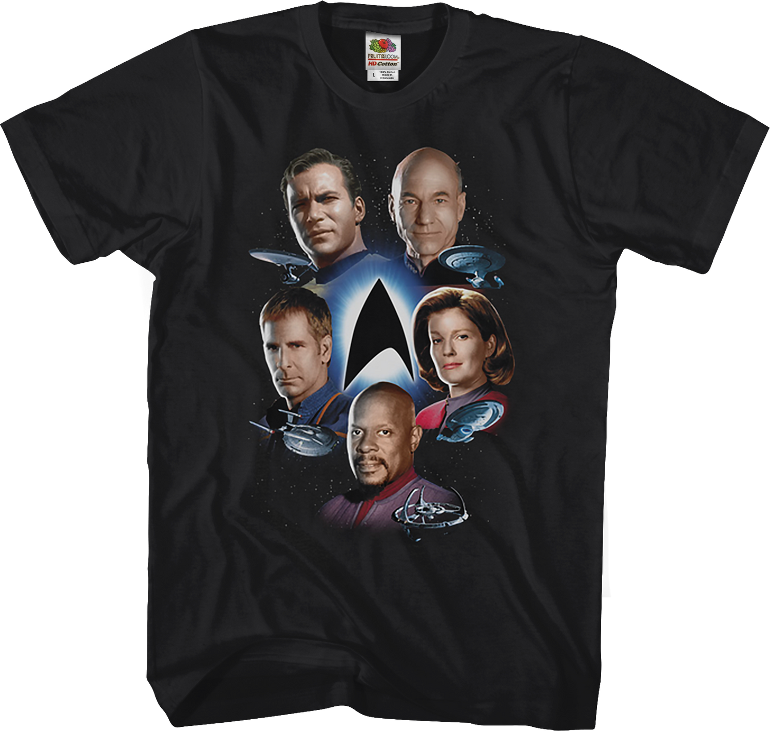 The shirt shows James T. Kirk from the original Star Trek series, Jean-Luc Picard from The Next Generation, Kathryn Janeway from Voyager, Benjamin Sisko from Deep Space Nine, and Jonathan Archer from Enterprise. The captains and their respective spacecrafts surround the Starfleet insignia.