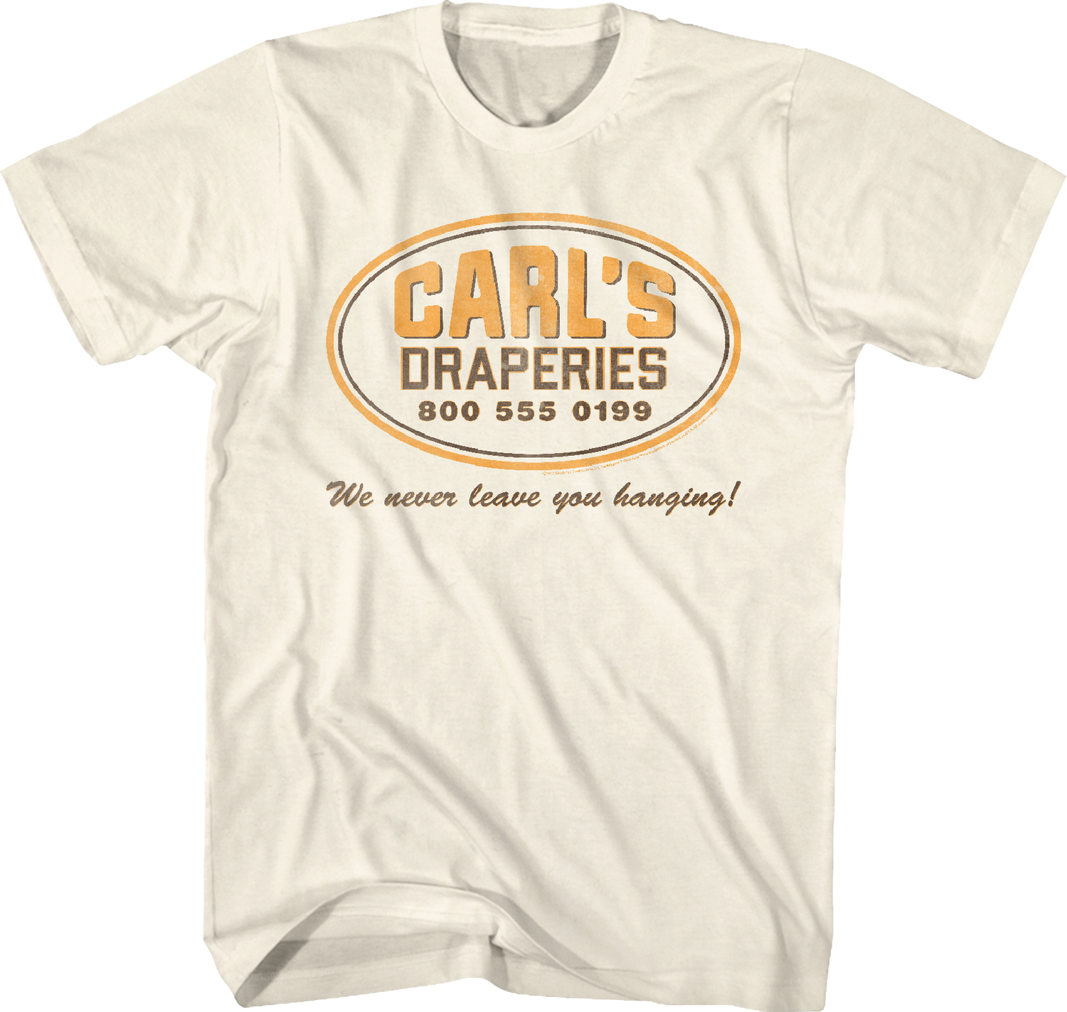 This Terminator: Dark Fate t-shirt features the logo for Carl's Draperies, and the company's slogan, "We never leave you hanging!"