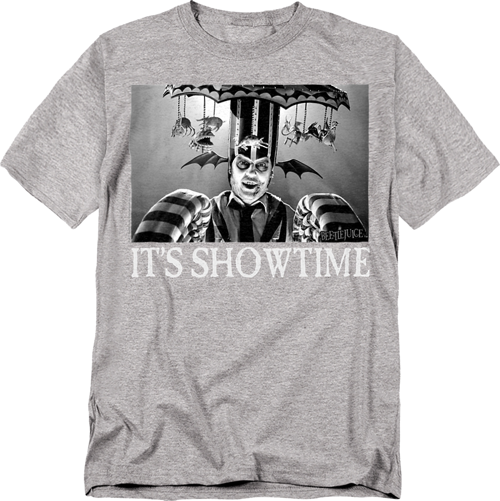 This Beetlejuice t-shirt shows Beetlejuice with a circus carousel headpiece and elongated arms. The shirt reads "It's Showtime."