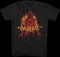 This Carrie T-Shirt shows a gruesome silhouette of Carrie White after a bucket of pig's blood was poured on her at her high school prom. The movie title is shown in block letters and flames are in the background. In the supernatural horror movie, the title character is constantly teased at school. She discovers that she has telekinetic powers and unleashes them on the classmates who tormented her.