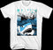 This Jaws t-shirt a cartoon great white shark emerging from the water in front of Quint's Orca fishing boat.