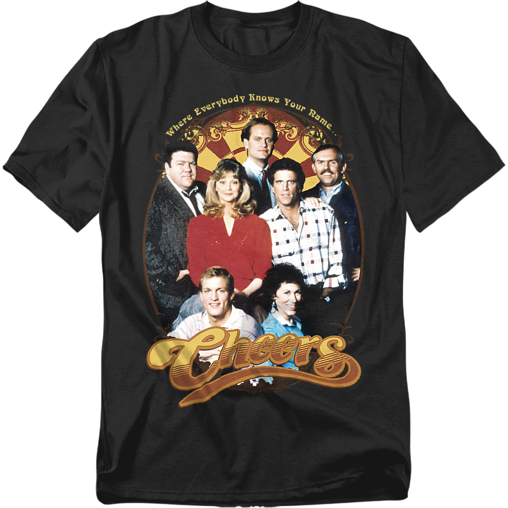This Cheers t-shirt features the cast of the iconic sitcom's fourth season. The shirt shows Woody Boyd, Diane Chambers, Norm Peterson, Frasier Crane, Cliff Clavin, Sam Malone and Carla Tortelli. This shirt includes the title of the Cheers theme song, Where Everybody Knows Your Name.
