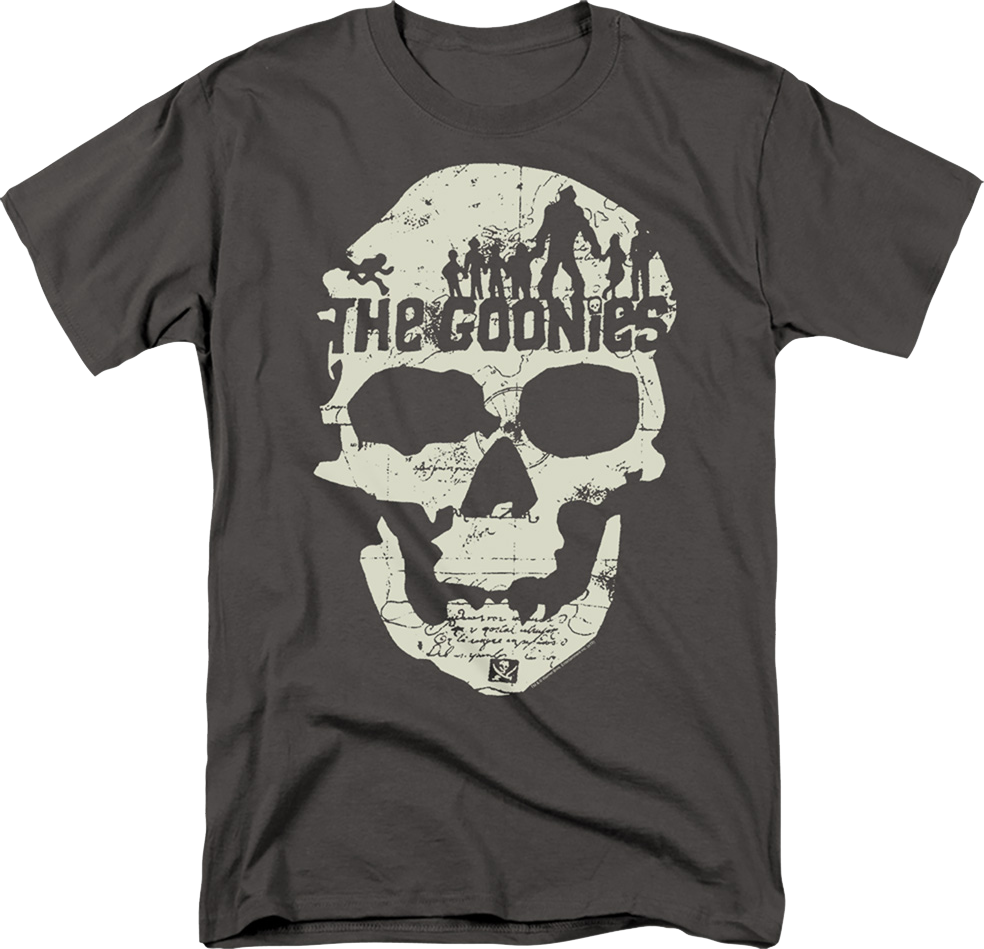 In an effort to save their homes from demolition, the Goonies followed an old map to find a pirate's hidden treasure. Along the way, they were chased by the Fratelli family in one of the greatest adventures in cinematic history. For any fan of the 1985 classic, this Charcoal Skull Silhouettes Goonies T-Shirt is a must have!