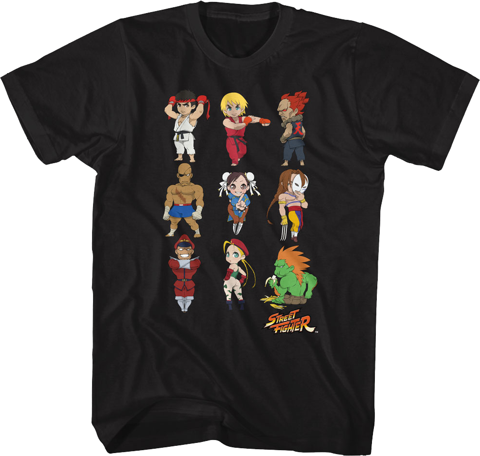This Street Fighter t-shirt features adorable chibi versions of the iconic characters Ryu, Ken Masters, Akuma, Sagat, Chun-Li, Vega, M. Bison, Cammy, and Blanka.