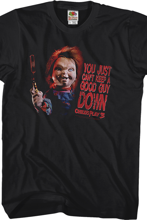 Time to bust out the How-To Voodoo book and get ready for some soul swappin', Chucky's back. When you wear this Child's Play 3 shirt you'll feel like Charles Lee Ray himself. Just remember to stay away from theme parks and giant fans, it won't end well for you. This movie scared our customer service rep Ry so much that if his children ever say the doll did it, that doll has an immediate appointment with the wood chipper.