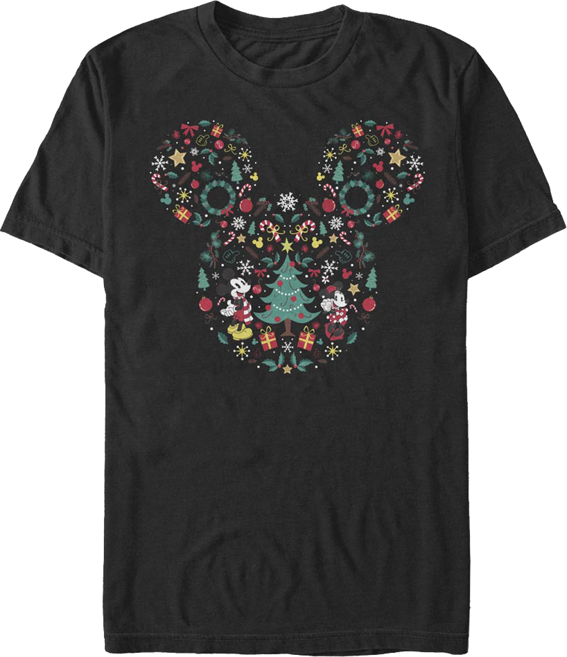 This Disney t-shirt shows the iconic shape of Mickey Mouse's head made out of Christmas decorations and presents.