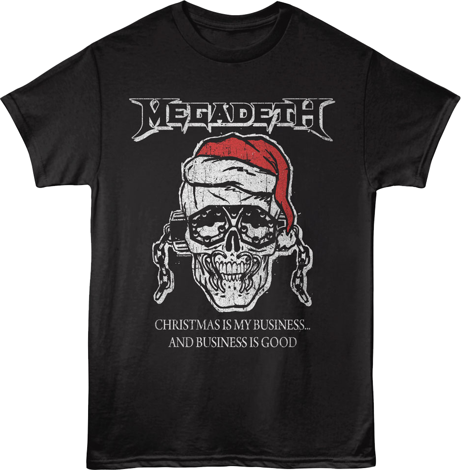 This Megadeth t-shirt shows the band's mascot Vic Rattlehead wearing a Santa Claus hat. The shirt reads Christmas Is My Business...And Business Is Good.