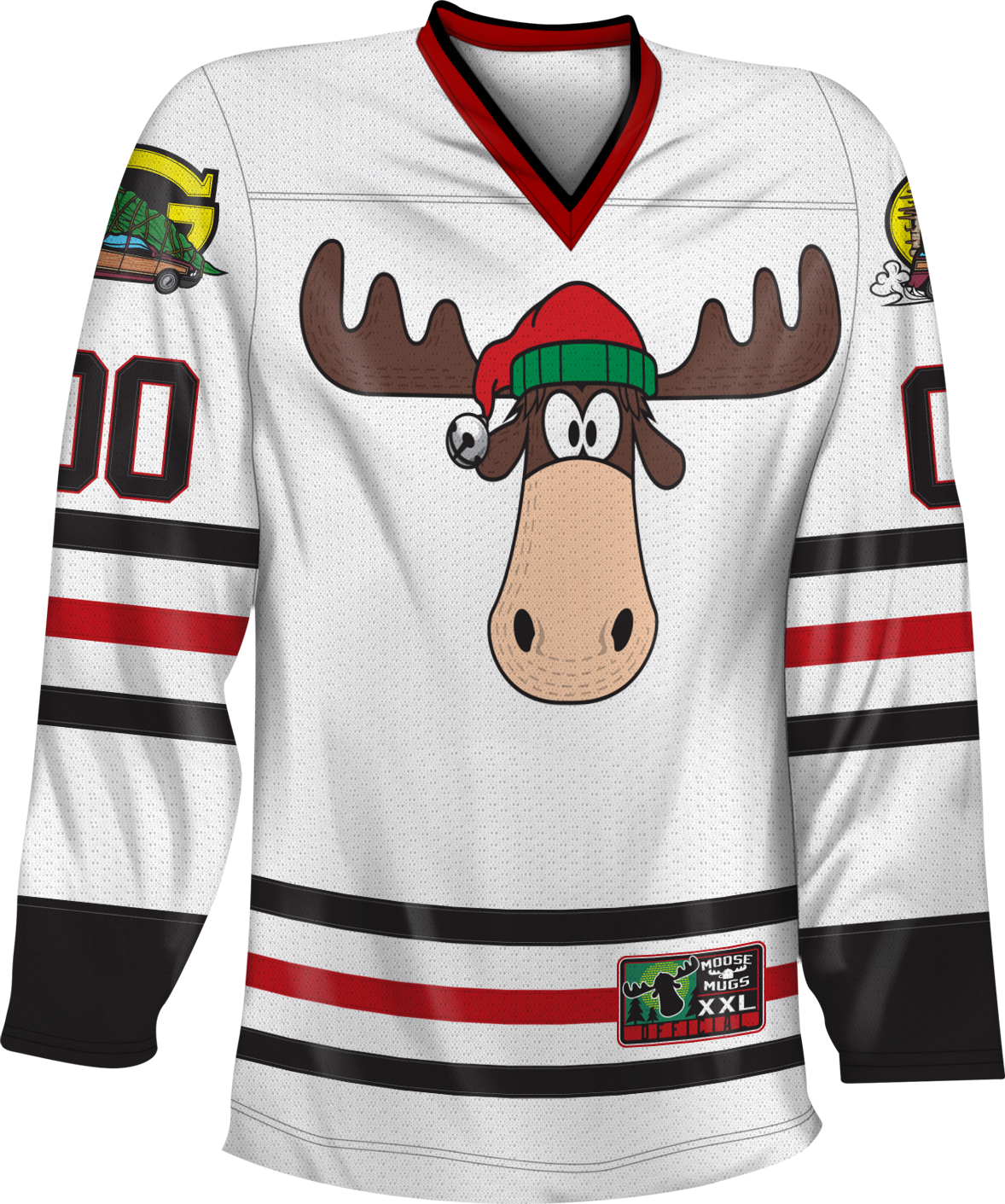 This 80sTees.com exclusive Christmas Vacation hockey jersey is designed to look like a jersey that Clark W. Griswold would wear on Christmas morning. The front of the jersey shows Marty Moose wearing a winter hat with a sleigh bell. The sleeves show a Griswold logo with a large letter G and a family truckster with a tree tied to the hood. The jersey has been given the number 00 and the name Griswold just like the jersey that Clark was seen wearing in Christmas Vacation. The jersey includes the outline of stitching to complete the look of an authentic hockey jersey!