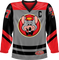 This 80sTees.com exclusive Chuck E. Cheese hockey jersey features an image of the popular restaurant entertainment character. The left sleeve shows Chuck E. Cheese's derby hat and crossed hockey sticks. The right sleeve and the back of the jersey show the number 77. The jersey was given the number 77 because the pizza restaurant chain was founded in 1977 by Atari's co-founder Nolan Bushnell. The back of the jersey includes the name Cheese. The jersey includes the outline of stitching and long sleeves to complete the look of an authentic hockey jersey!