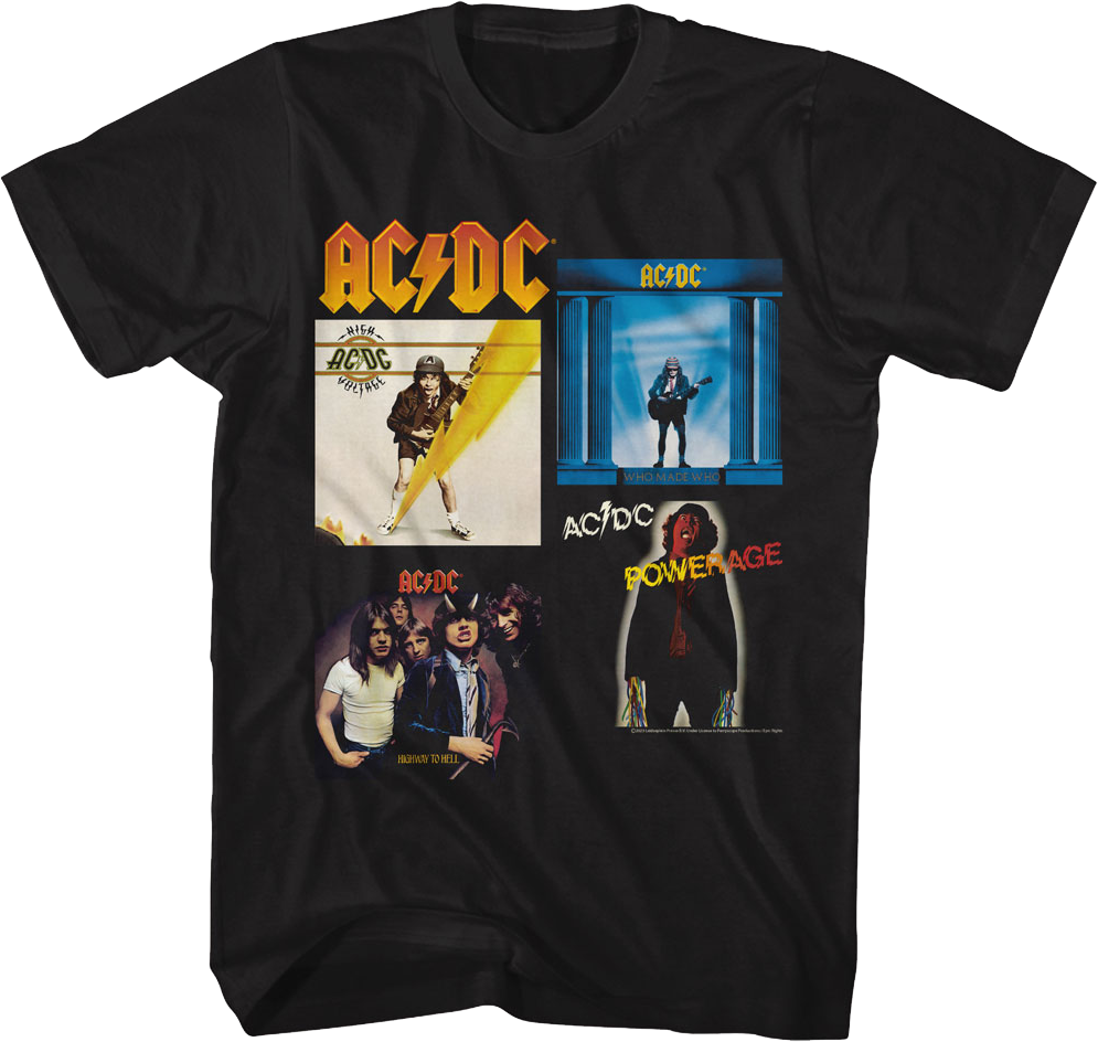 This AC/DC shirt shows the cover artwork for four of the band's most popular albums. These albums include High Voltage (features "It's A Long Way To The Top (If You Wanna Rock 'N' Roll)", "T.N.T." and "Live Wire"); Who Made Who (features "Chase The Ace", "Who Made Who" and "D.T."); Highway To Hell (features "Touch Too Much", "Night Prowler" and "Get It Hot"); Powerage (featuring "Rock 'N' Roll Damnation", "Riff Raff" and "Down Payment Blues").