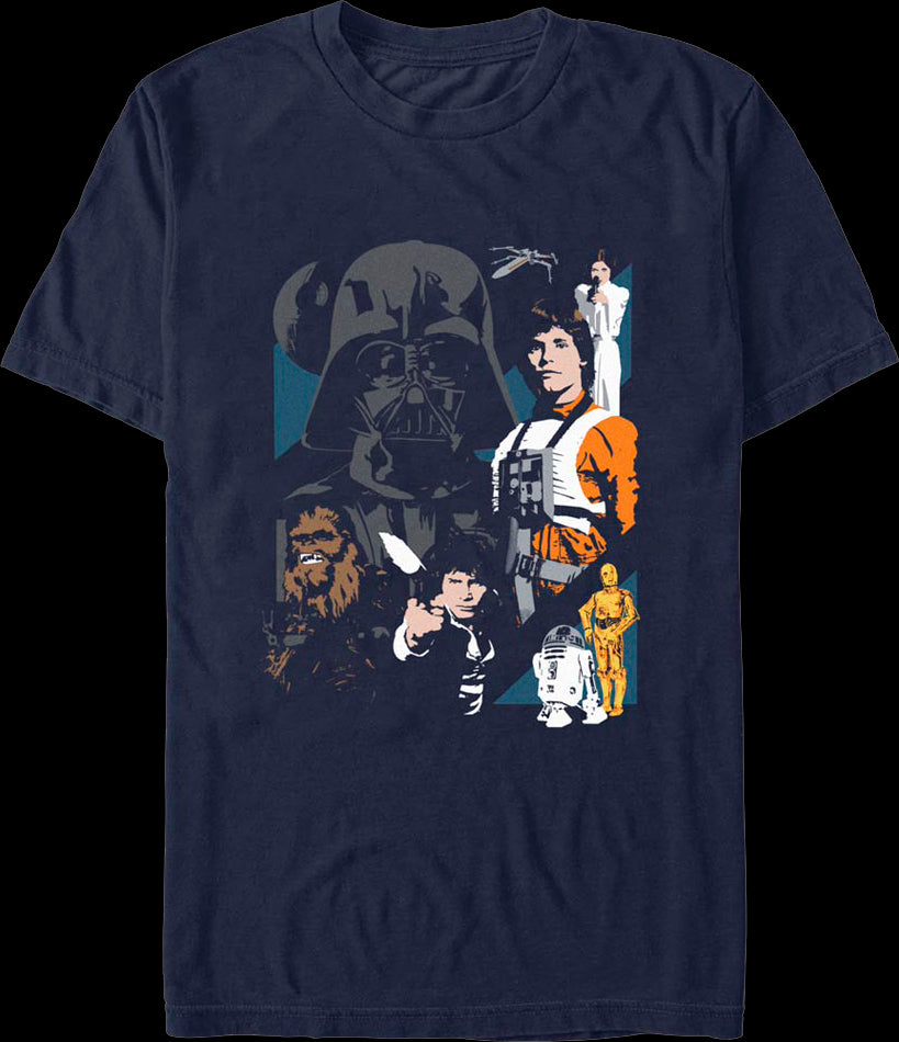 This Star Wars t-shirt features a collage of the iconic characters Darth Vader, Princess Leia, Luke Skywalker, C-3PO, R2-D2, Han Solo, and Chewbacca.