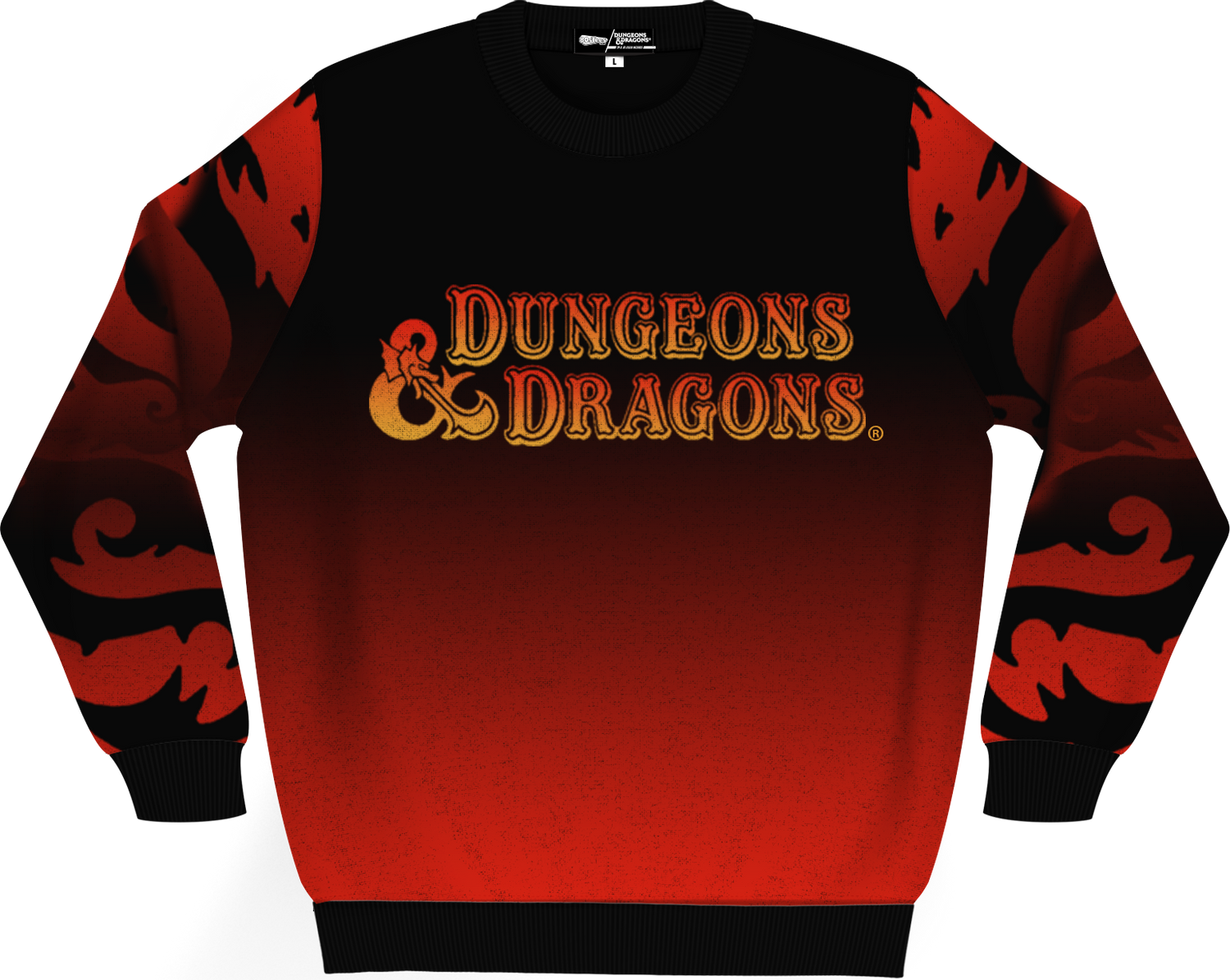 This 80sTees.com exclusive Dungeons & Dragons knitted sweater features the logo for the iconic role-playing game. The sleeves include images of dragons.